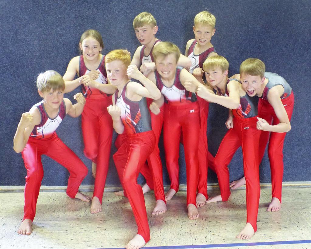 Folgende Turner von links nach rechts sind abgebildet: Levi Witschorek, Jonathan Steinberg, Erik Wiemers-Meyer, Sam Fehler, Mats Kemper, Nils Hille, Oskar Dülberg, Lennert Dülberg.