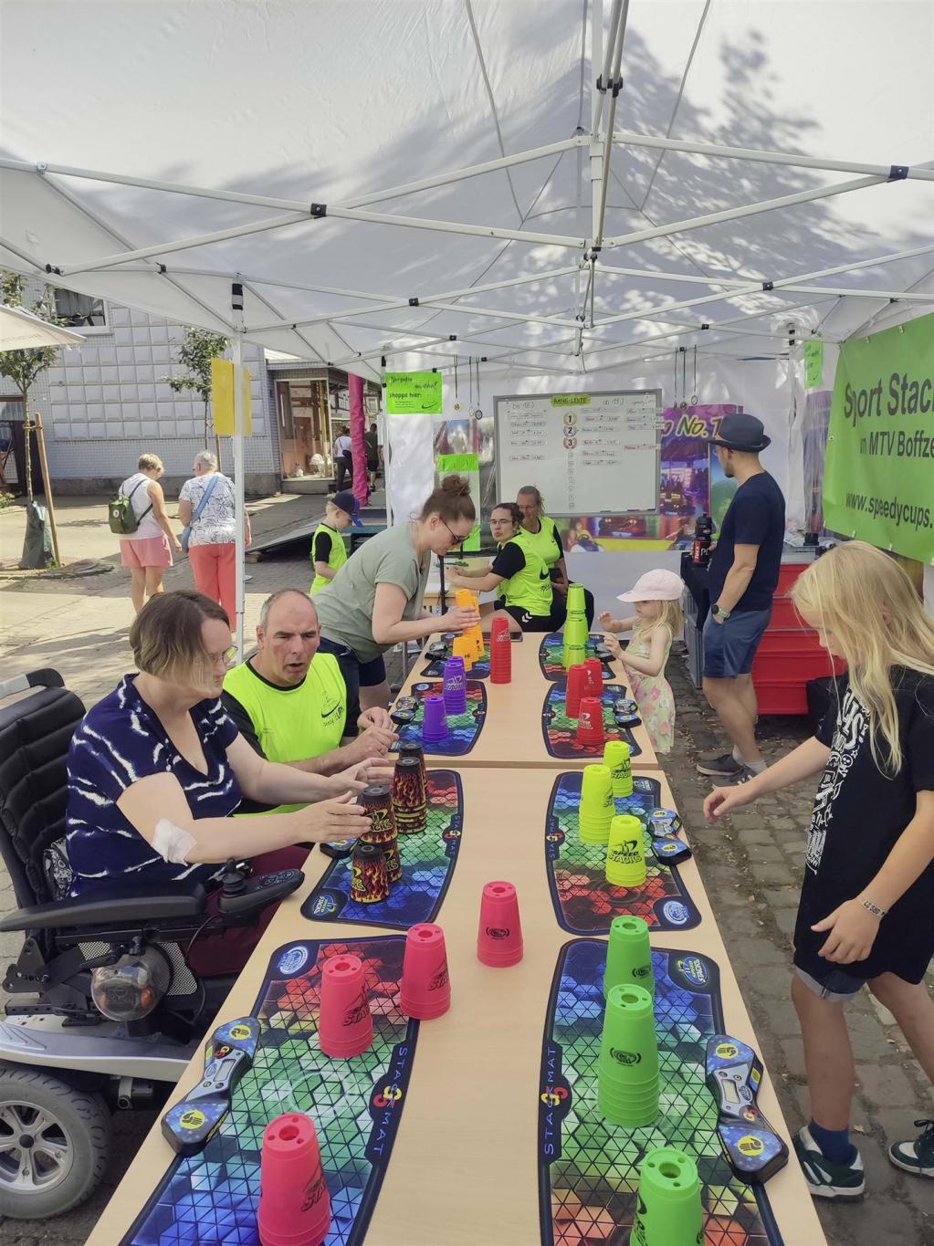 Den ganzen Tag über war bei strahlendem Sonnenschein an den acht Stacking-Trainingsplätzen, die der MTV Boffzen bereitgehalten hat, Hochbetrieb. Jeder Teilnehmer konnte dabei ausprobieren, wie schnell er die Übungen schafft. An einem Schiedsrichtertisch gab es dann die Möglichkeit, offiziell die Zeit messen zu lassen. Dabei war es durchaus erlaubt, es erneut zu versuchen und die erreichte Zeit zu verbessen. Die Mitglieder der „speedy cUP!s“ haben an einer Magnet-Tafel die sich ständig ändernde Rangreihenfolge transparent für das gesamte Publikum dokumentiert.