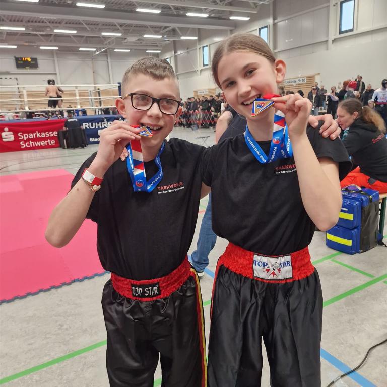 Einen großen Erfolg haben Marina Eckert und Janneck Weyer von der Taekwon Do-Kampfgemeinschaft MTV Boffzen/Fürstenberg bei der Offenen Westdeutschen-Kickbox-Meisterschaft 2025 in Dortmund gefeiert. Mit drei Goldmedaillen und einmal Bronze schafften sie es trotz dieser kleinen Besetzung sogar in die Top Ten der Vereinswertung!