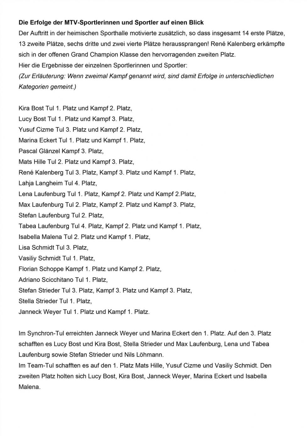 Lukas Keller 3.Platz im Tul und Freikampf., Liv Lohnert ebenfalls den 3.Platz im Tul und Kampf. Sven Lohnert erreichte im Tul-Lauf sowie Kampf den 2. Platz. Inken Biel erreichte im Tul den 2. Platz. Charline Gollartz den 3.Platz im Freikampf. Stefan Kohl wurde 2. im Freikampf der B Jugend. Namtan Nataporn Na Pattlang den 3. Platz im Tul B Jugend.