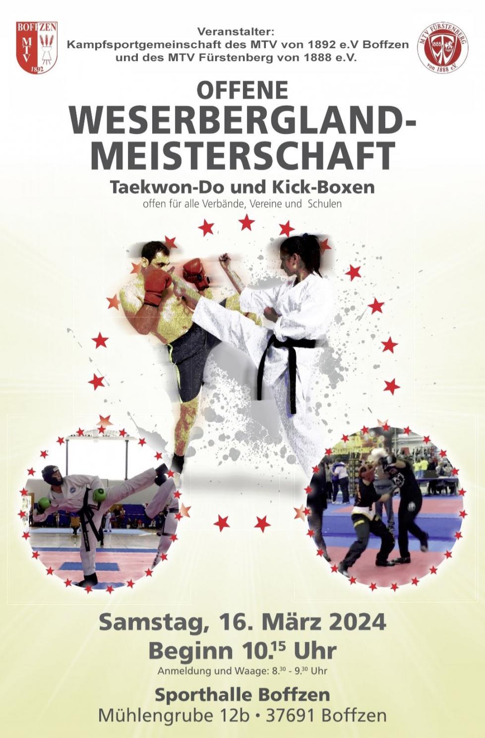 Bei den diesjährigen offenen Weserbergland-Meisterschaften im Taekwondo und Kickboxen durfte die ausrichtende Kampfgemeinschaft des MTV Boffzen + des MTV Fürstenberg 16 Sportvereine/-schulen mit 156 Sportlern aus den Städten Dortmund, Paderborn, Hövelhof, Schloss Neuhaus, Schwerte, Hemer, Rees, Gevelsberg, Göttingen, Peine, Glandorf, Heek, Bad Oeynhausen, Haltern am See, Bad Arolsen und Kickboxteam Solavida aus Holzminden in Boffzen begrüßen.
