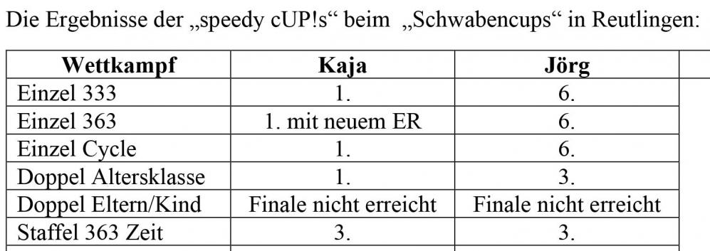 Schließlich durften nur noch die zehn Schnellsten weitermachen und um die Medaillen kämpfen, was für riesige Begeisterung beim Publikum sorgte. Bei der Siegerehrung für die Plätze vier bis sechs und als Höhepunkt die Podiumsplätze eins bis drei gab es einen tosenden Applaus. Für das nächste Jahr sind die "speedy cUP!s" bereits wieder angefragt, weil die Aktion hervorragend angenommen wurde.