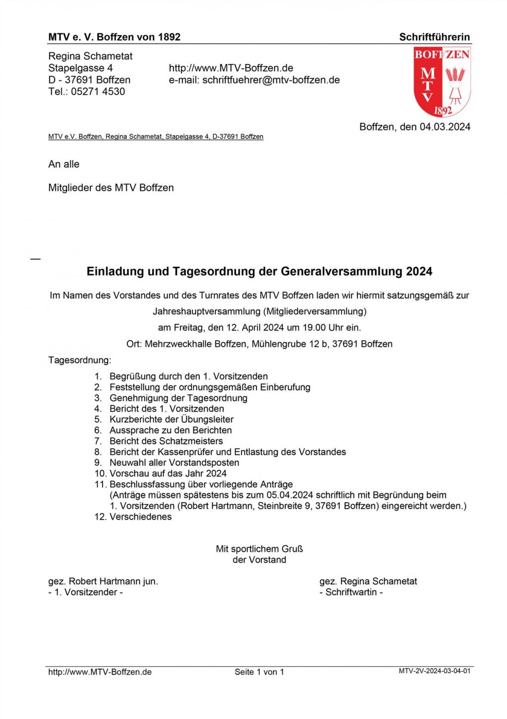 in Ergänzung zu den offiziellen Aushängen anbei die Einladung und Tagesordnung zur diesjährigen Jahreshauptversammlung des MTV Boffzen am 12.04.2024 um 19.00 Uhr. Bitte beachtet den Ort der Versammlung: Mehrzweckhalle Boffzen.