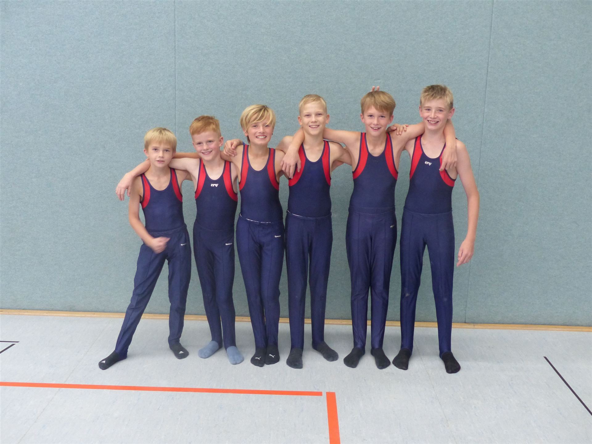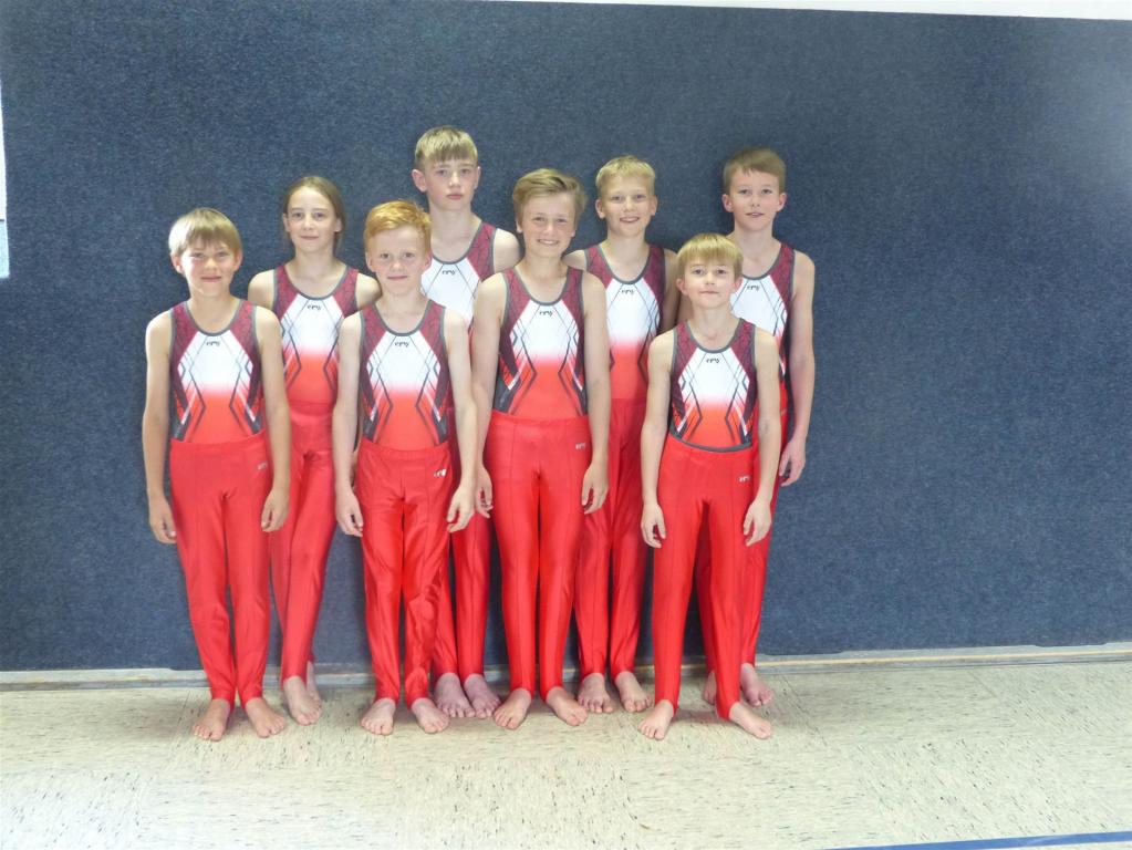 Folgende Turner von links nach rechts sind abgebildet: Levi Witschorek, Jonathan Steinberg, Erik Wiemers-Meyer, Sam Fehler, Mats Kemper, Nils Hille, Oskar Dülberg, Lennert Dülberg.