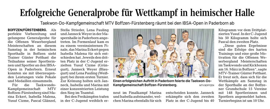 MTV-Trainer Günter Potthast war nach den zahlreichen ersten Plätzen im letzten Jahr diesmal mit der Ausbeute in Dortmund nicht voll zufrieden, nahm es aber gelassen: „Vielleicht haben unsere Kämpferinnen und Kämpfer ihr volles Potential noch nicht ausgeschöpft, um dieses lieber vor heimischem Publikum zu präsentieren“. Stella Strieder, Marina Eckert, Isabella Malena, Janneck Weyer sowie Kira und Lucy Bost sind für die Kampfsportgemeinschaft Boffzen/Fürstenberg in der Sporthalle der Geschwister-Scholl-Gesamtschule Dortmund an den Start gegangen.