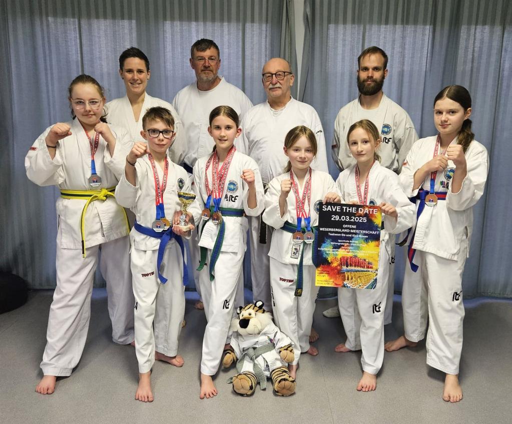 Zeigten sich hoch motiviert bei den Offenen Weserberglandmeisterschaften im Taekwon-Do und Kickboxen (vorne von links): Janneck Weyer, Marina Eckert, Vasily Schmidt, Isabella Malena, Kira Bost, Talea Voss und Lisa Schmidt. Dahinter (von links) Stefan Laufenburg, Niels Löhmann, Lea Pauling, Yusuf Cizme, Lucy Bost, Stella Strieder und Max Laufenburg.