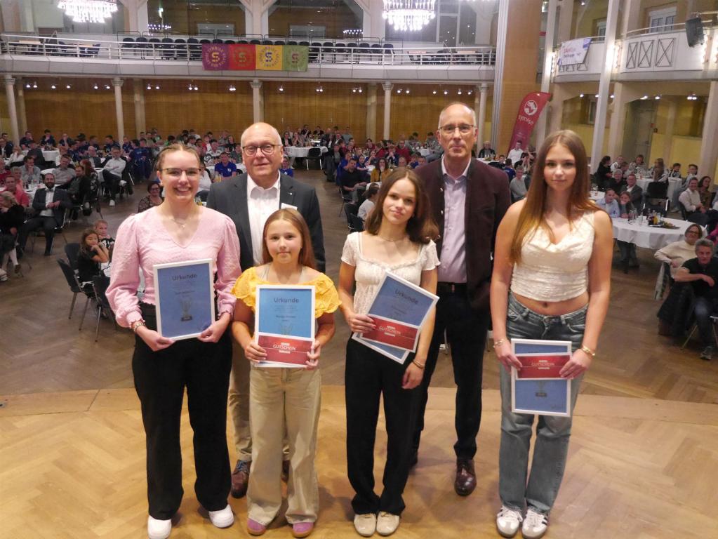 Großartige Leistungen in ihren Sportarten brachten (vorne von links) Kaja Schilcher, Naraja Riemer, Klara Härke und Alexandra Melnichuk aufs Podest. Darüber freuen sich (hinten von links) Bernd Wiesendorf und Oliver Fuchs.